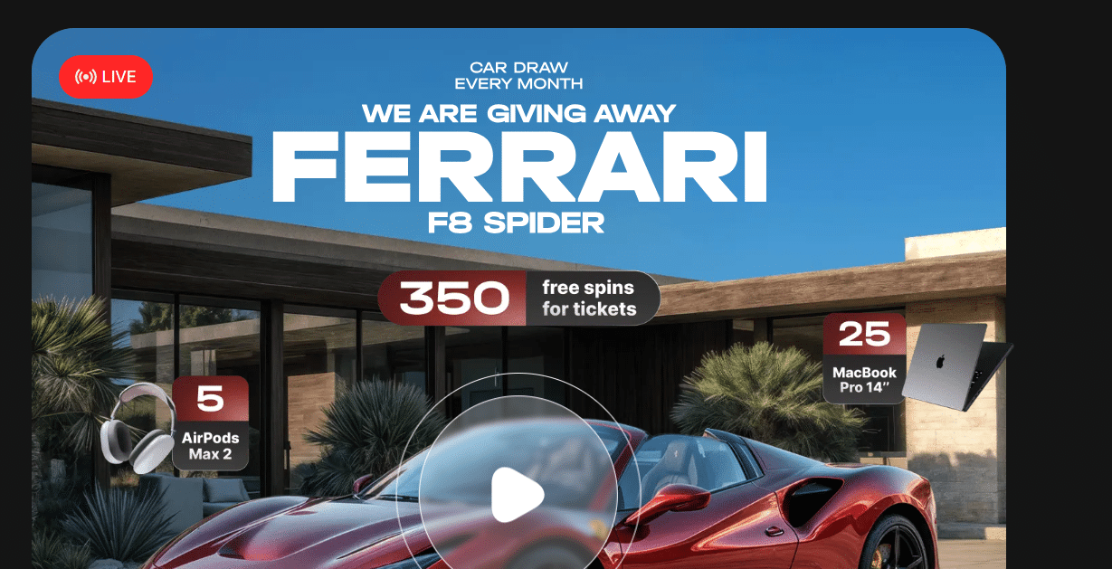 Join the LUCKY DRIVE promotion for a chance to win a Ferrari F8 Spider, Apple gadgets, or hundreds of free spins! To enter, make a deposit of $10 or more and collect tickets daily from the Free Money section. Each ticket boosts your chances of winning, with extra perks for collecting multiple tickets — such as up to 350 free spins for those who gather over 30 tickets. The giveaway runs from October 15 to November 15, 2025, with physical prizes including 25 iPhone 17 Pro Max units, 25 MacBook Pro 14’’ M3s, and AirPods Max for the most dedicated participants.