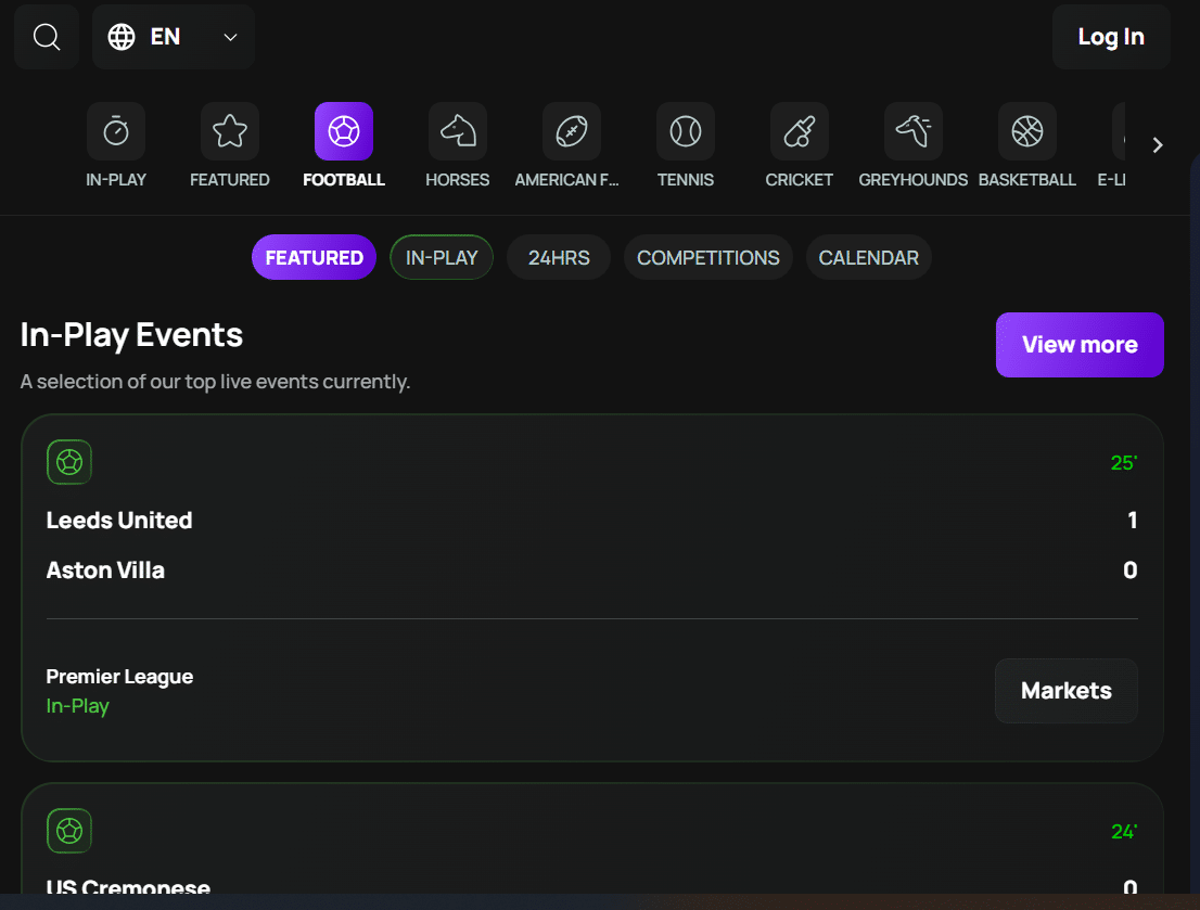 - Football: Match winner, over/under goals, both teams to score, handicaps.