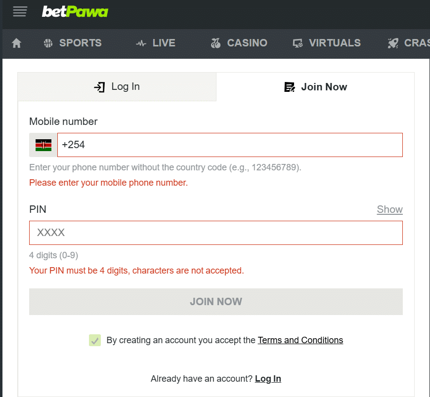 The registration and account creation process on BetPawa Kenya is straightforward and user-friendly. To create an account, you begin by clicking “Join Now” on the BetPawa site. You are asked to enter your mobile number, specifically a Kenyan number (+254), and then choose a 4‑digit PIN. This is not a long alphanumeric password, just a simple 4-digit code.