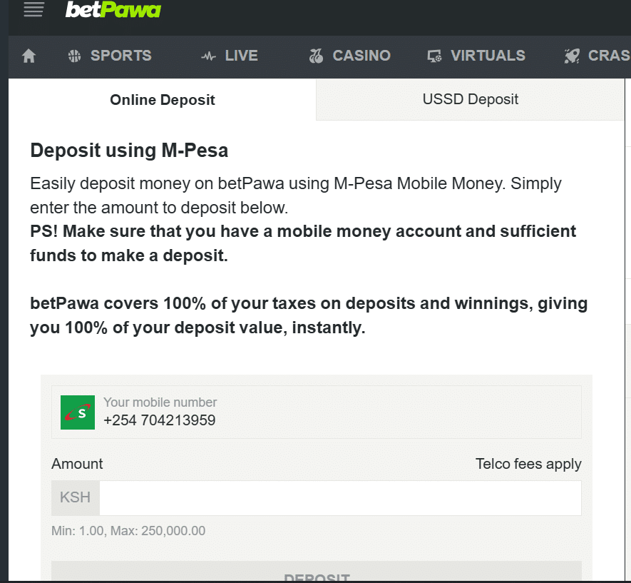 BetPawa Kenya primarily supports M‑Pesa for both deposits and withdrawals. This is the main method used by Kenyan customers. To deposit via M‑Pesa, users make payments using the PayBill number 290020 and enter “PAWA” as the account or reference name. Deposits can be made through the M‑Pesa USSD menu (*334#) or by using the Lipa Na M‑Pesa → PayBill method. The minimum deposit is very low, starting from just KES 1, while the maximum single deposit is around KES 70,000. Deposits are almost instant, and BetPawa does not charge additional fees, although standard M‑Pesa network charges may apply.