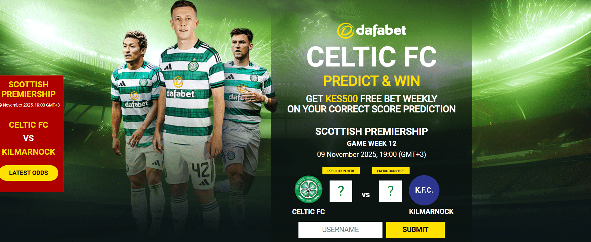 Show off your football prediction skills with Dafabet’s Celtic FC Predict & Win challenge! Simply predict the correct score of Celtic’s upcoming Scottish Premiership match against Kilmarnock on November 9, 2025, and you could win a KES 500 free bet every week. The promo is open to all Dafabet users, and new players can sign up to take part instantly. Submit your score prediction before kick-off, and if you nail the result, your free bet will be credited — no extra wagering needed. It’s the perfect way to back your football knowledge and enjoy the thrill of the game with real rewards.