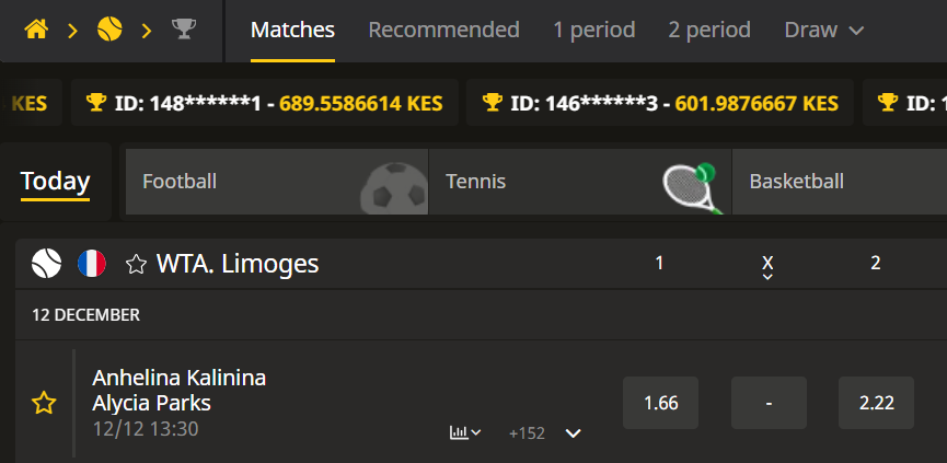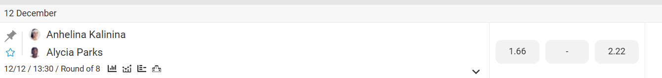 (ALT text: Screenshot of a Megapari betting line for the 12 December WTA Limoges match between Anhelina Kalinina and Alycia Parks with decimal odds 1.66 for Kalinina and 2.22 for Parks.)