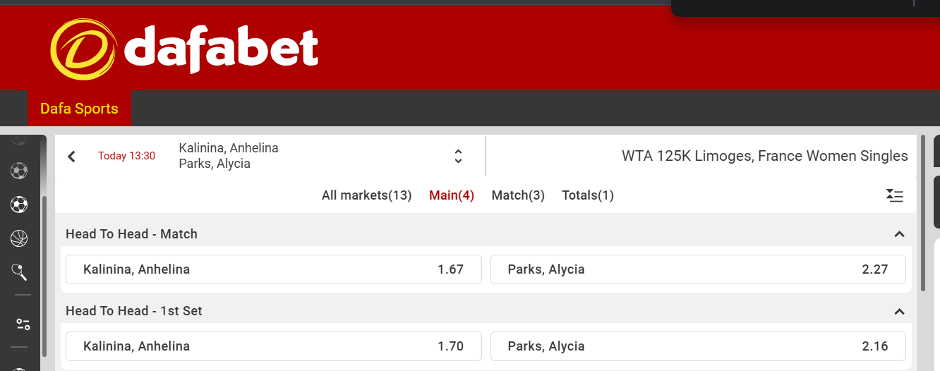 (ALT text: Screenshot of a Dafabet tennis betting page showing WTA 125K Limoges match between Anhelina Kalinina and Alycia Parks with head-to-head and first set winner odds.)