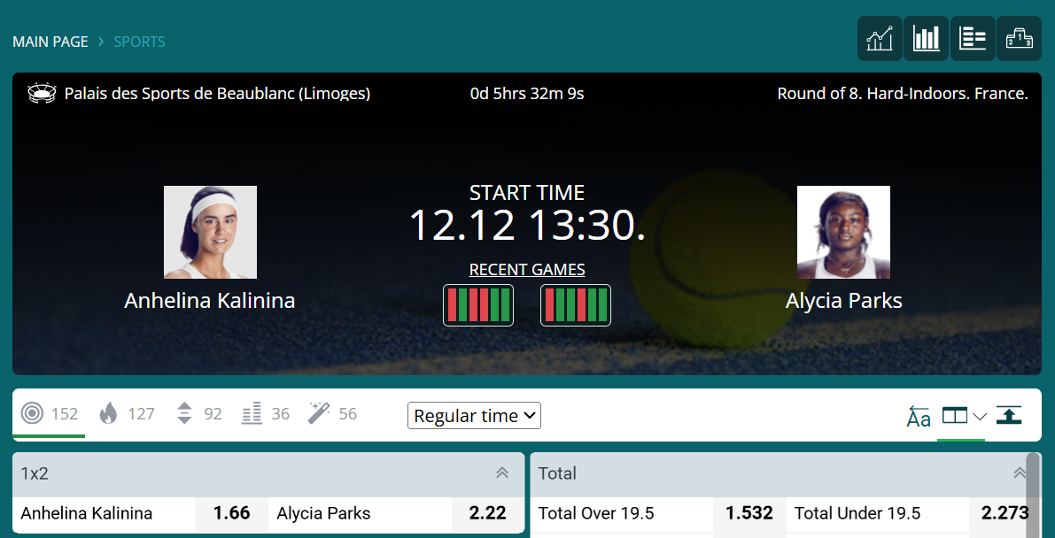 (ALT text: Screenshot of a 22bet tennis match page showing upcoming Anhelina Kalinina vs Alycia Parks game with displayed decimal odds for match winner and total games.)